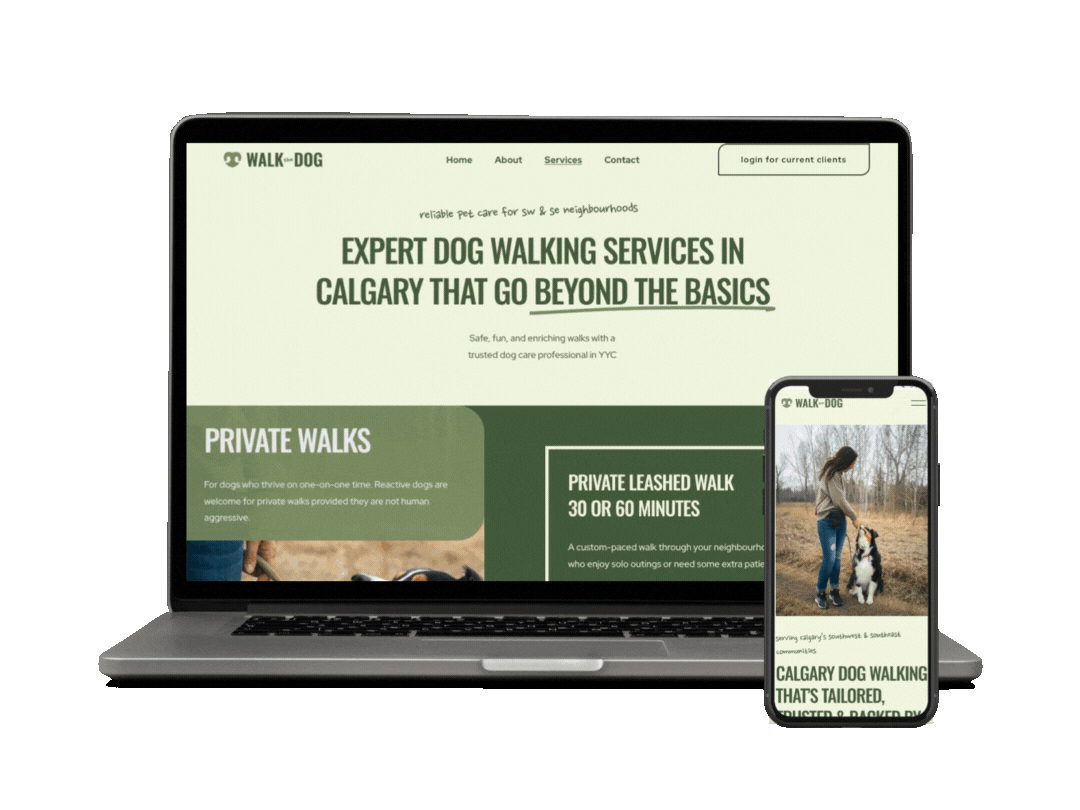 With a strong brand foundation and a clear, user-friendly site, Erin is set up to grow her client base and build lasting relationships with pet owners in South Calgary. As Walk The Dog YYC gains traction, the site can easily expand to include service add-ons, blog content, or even integrated scheduling tools as her business evolves.